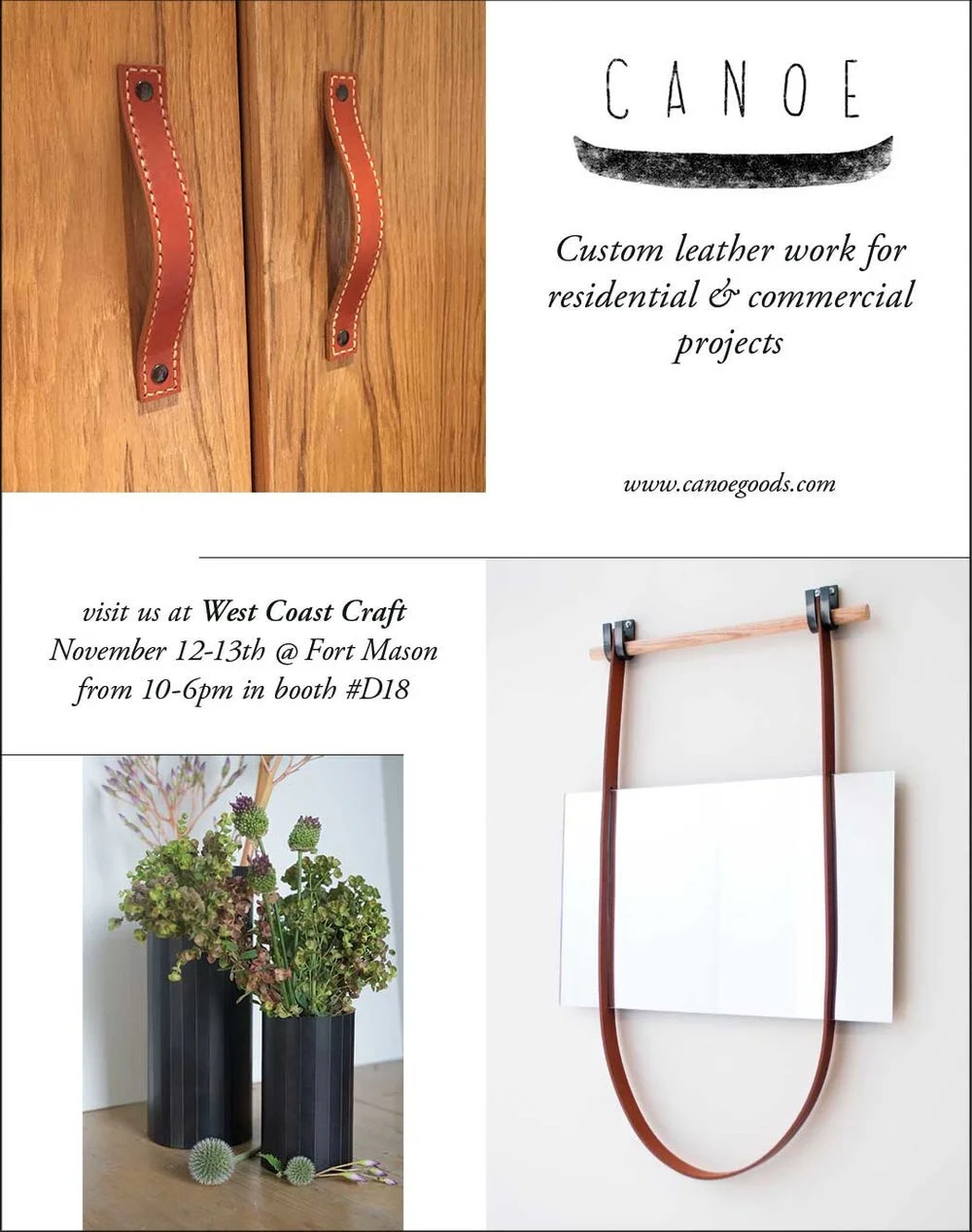 We're excited to be headed back to San Francisco this week for West Coast Craft, November 12-13th at Fort Mason Festival Pavilion from 10-6pm. This show is filled with my favorite artists from around the US, so it's both inspiring and draws such a great crowd. Our booth will be smack in the middle (D18 on the map), so please swing by and say hello! We'll be bringing our custom leather goods, new furniture, and artwork. If you're an interior designer or architect, we'd especially love to chat with you about collaborating on a project!